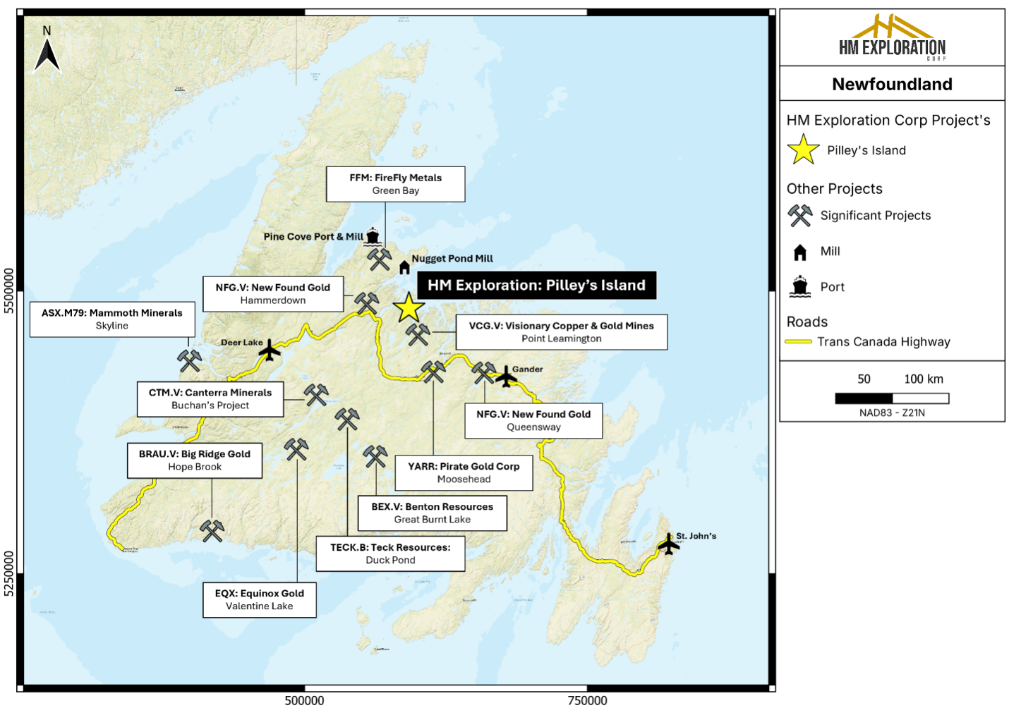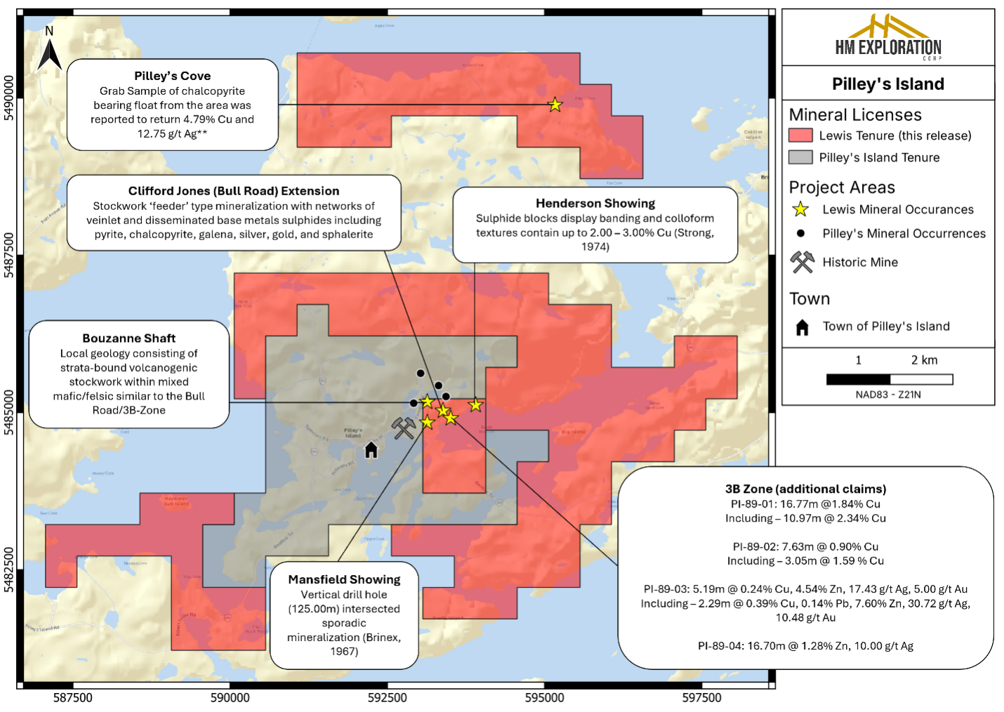 “This acquisition expands HM’s control of the Pilley’s Island VMS district,” said Nicholas Rodway, CEO of HM Exploration. “With promising historic copper drilling intercepts and multiple undrilled targets, we believe the district holds strong discovery potential. We are excited to hit the ground running for HM’s first ever diamond drill program.”