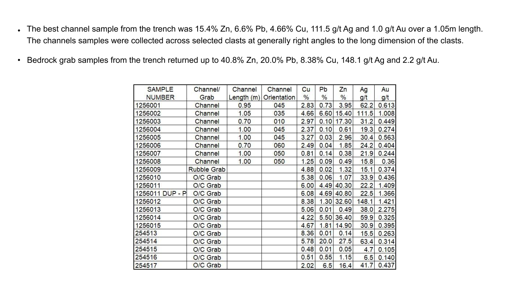 - The best results from bedrock grab samples from the trench returned up to 40.8% Zn, 20.0% Pb, 8.36% Cu, 148.1 g/t Ag, 2.28 g/t Au