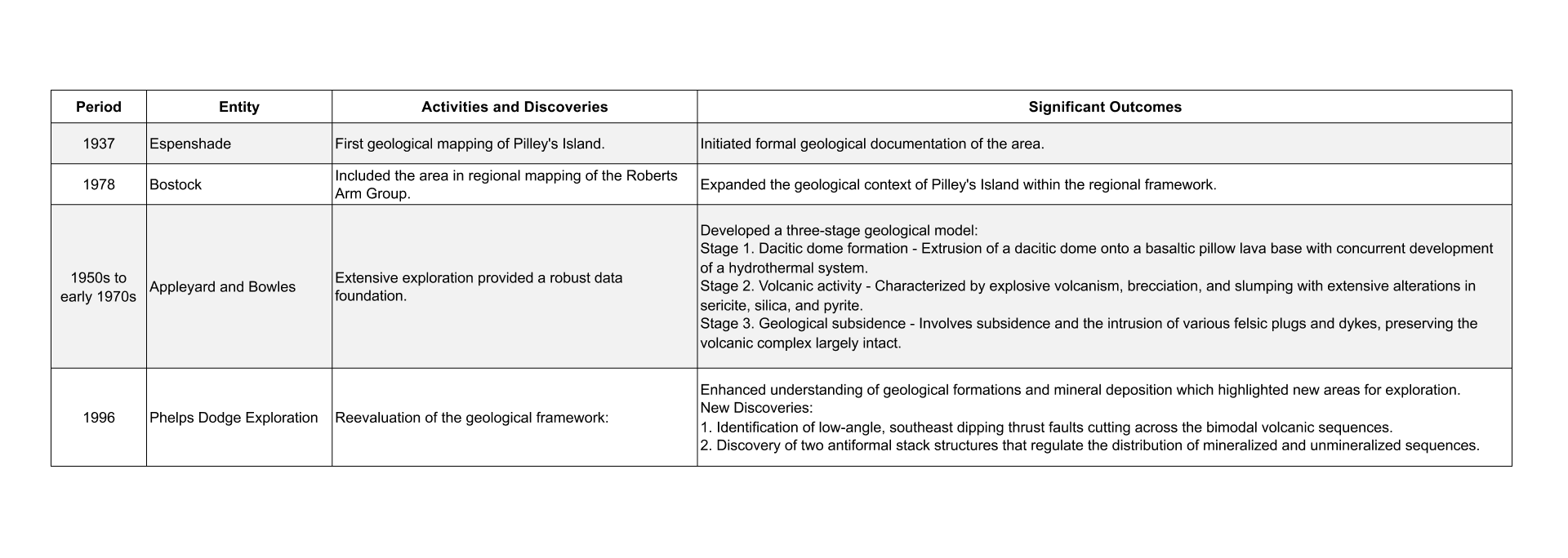 The Roberts Arm Group, which hosts known mineralization, is complexly faulted and consist of an older tholeiitic terrane overlain by more calc- alkaline thrust slices. It is suggested that it represents an evolution from tholeiitic, back arc basalts to calc-alkaline intermediate to felsic volcanics deposited at about the time of continental collision in a neritic to littoral environment.