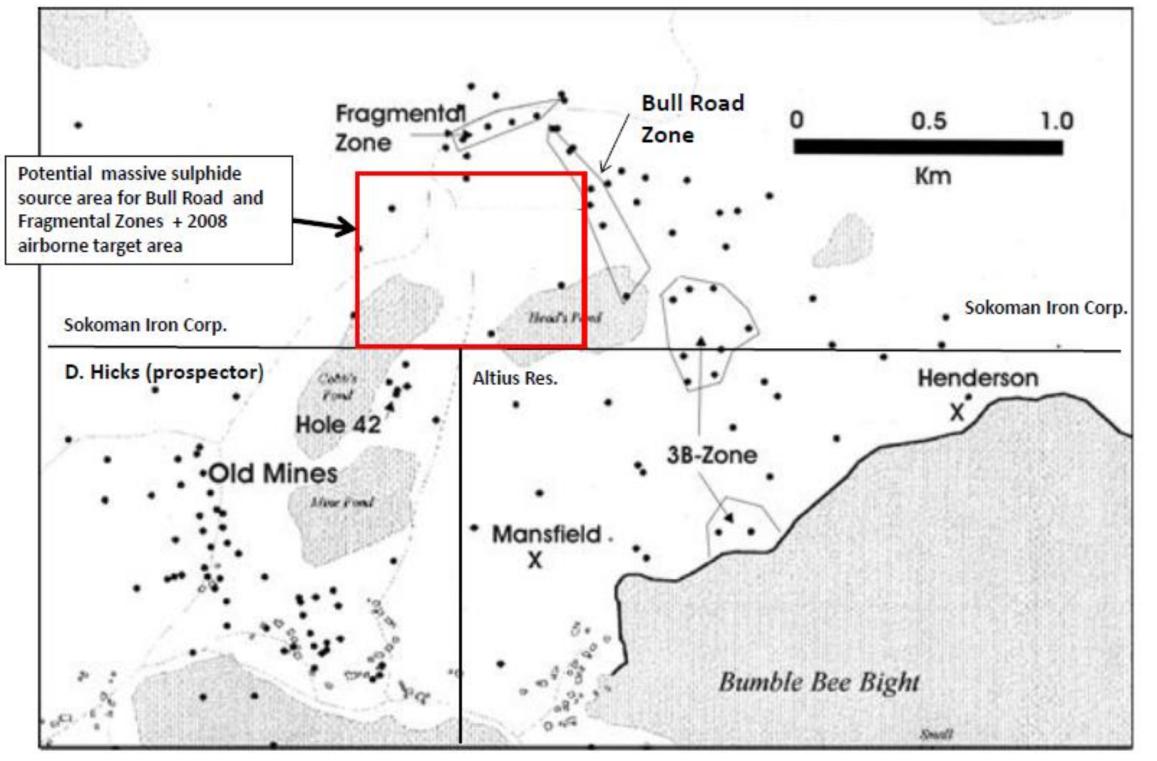 - The showings at Bull Road are significant, indicating the potential for an ore-grade deposit source, characterized by re-sedimented, polylithic breccia containing abundant high-grade Zn-Pb-Cu sulfide clasts similar to the breccia ores found at Buchans.
