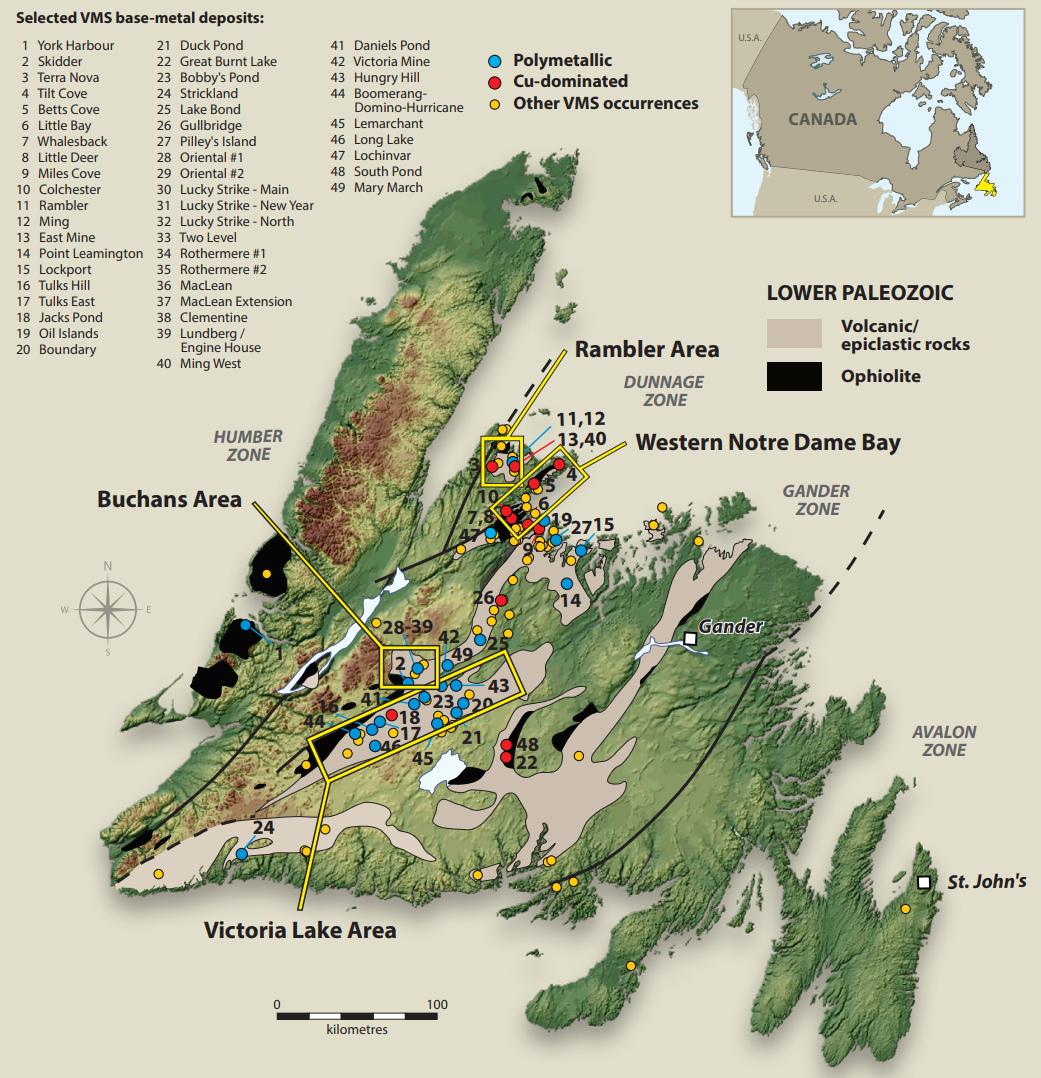 Also shown are the locations of the significant VMS occurrences.